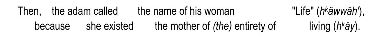 The Creator God delegated to the Adam the authority to name the “living souls” which inhabited the earth with him. Though God had created them, He had also designed and built into the Adam both the knowledge and the understanding to provide the names. The Adam was to use his perfect linguistic and reasoning abilities to discern names, and these names would be a reflection of the unfettered relationship between him and the Creator. Thus, when that first human named the woman who had been perfectly designed and built and brought to him to jointly assist him in fulfilling all that God intended him to do, he gave to her a name that reflected not only his own perception but also that of the Creator who built her.