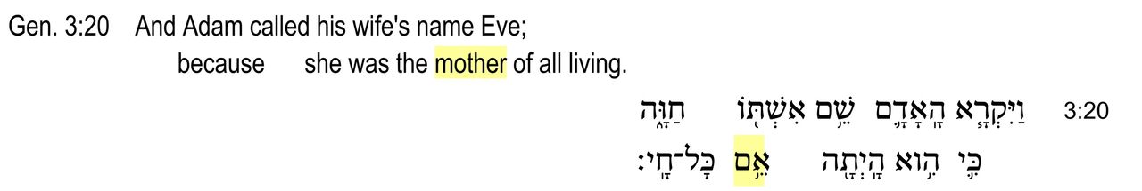 This kind of reasoning, however, is typical of a world at enmity with God. Humans think themselves sufficient in knowledge and authority to define what a “mother” is, but their knowledge is limited, finite, and their seeming authority is not valid. Indeed, the Creator, and the Creator alone, possesses both the knowledge and the authority to define perfectly and accurately any and every thing that exists. When He moved Adam to inscribe the words of Genesis 3:20 in what has become known as the Hebrew language, He expressed the nature of a “mother” using two different nouns but from the same linguistic root, “to live.” The text of this verse could be literally translated: